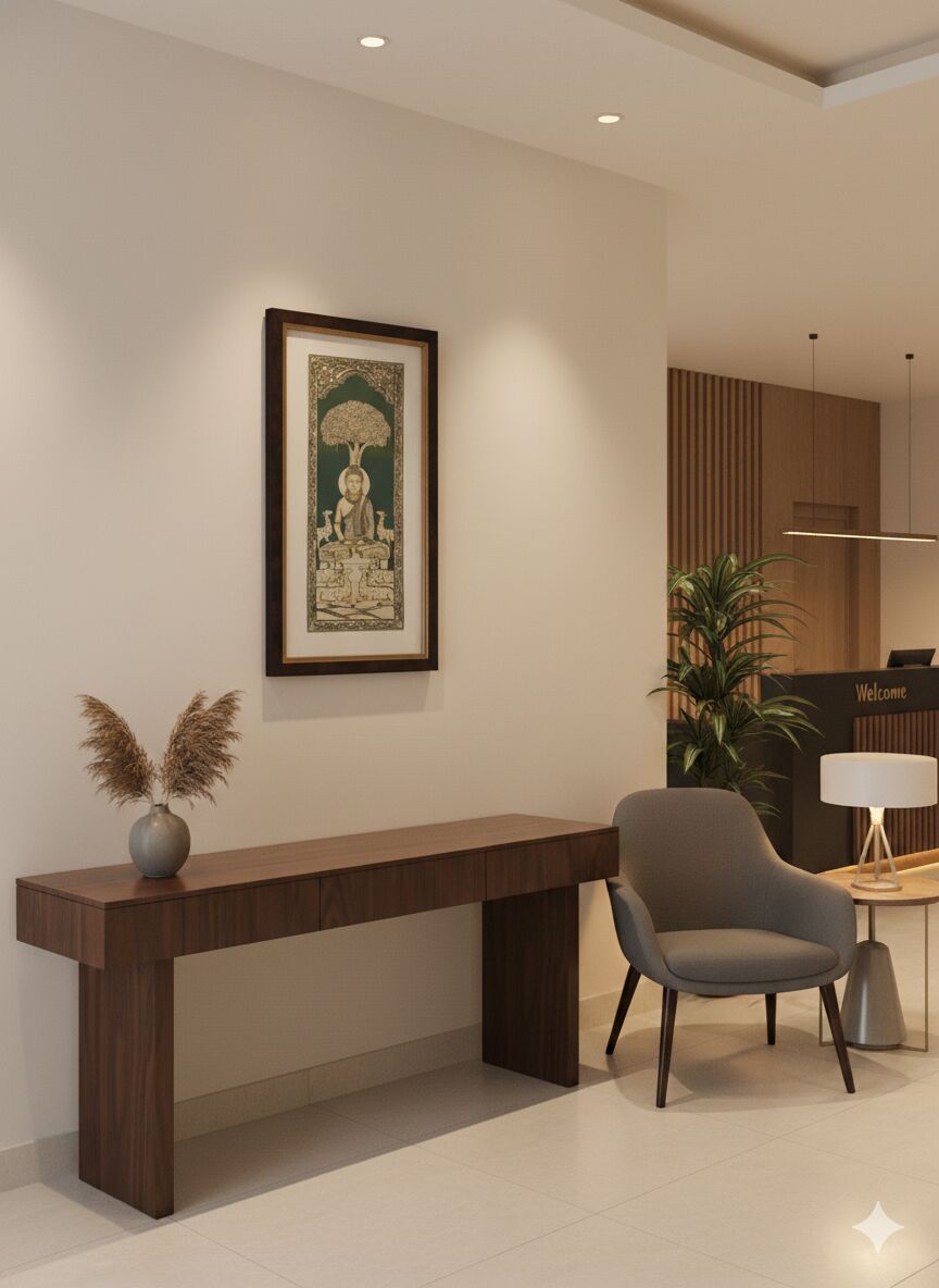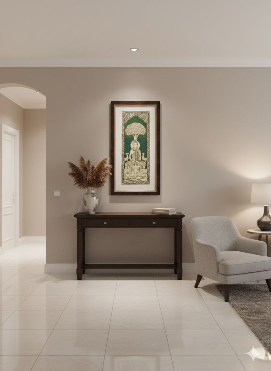 Handmade pattachitra painting of lord Buddha on tusar silk cloth with brown golden wooden frame. Dimensions 52cmx26cm
